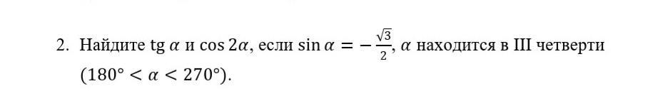 Найдите tg α и cos2α, если sinα=-√3/2, α находится в III четверти (180°<α<270°).