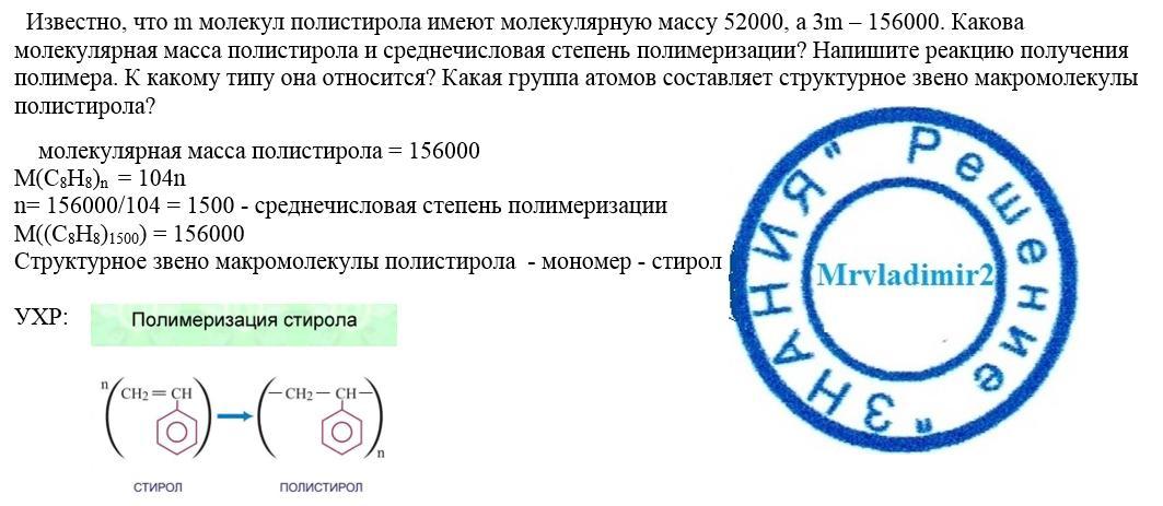 Известно, что m молекул полистирола имеют молекулярную массу 52000, а 3m – 156000. Какова молекулярная масса полистирола и среднечисловая степень полимеризации? Напишите реакцию получения полимера. К какому типу она относится? Какая группа атомов составляет структурное звено макромолекулы полистирола?