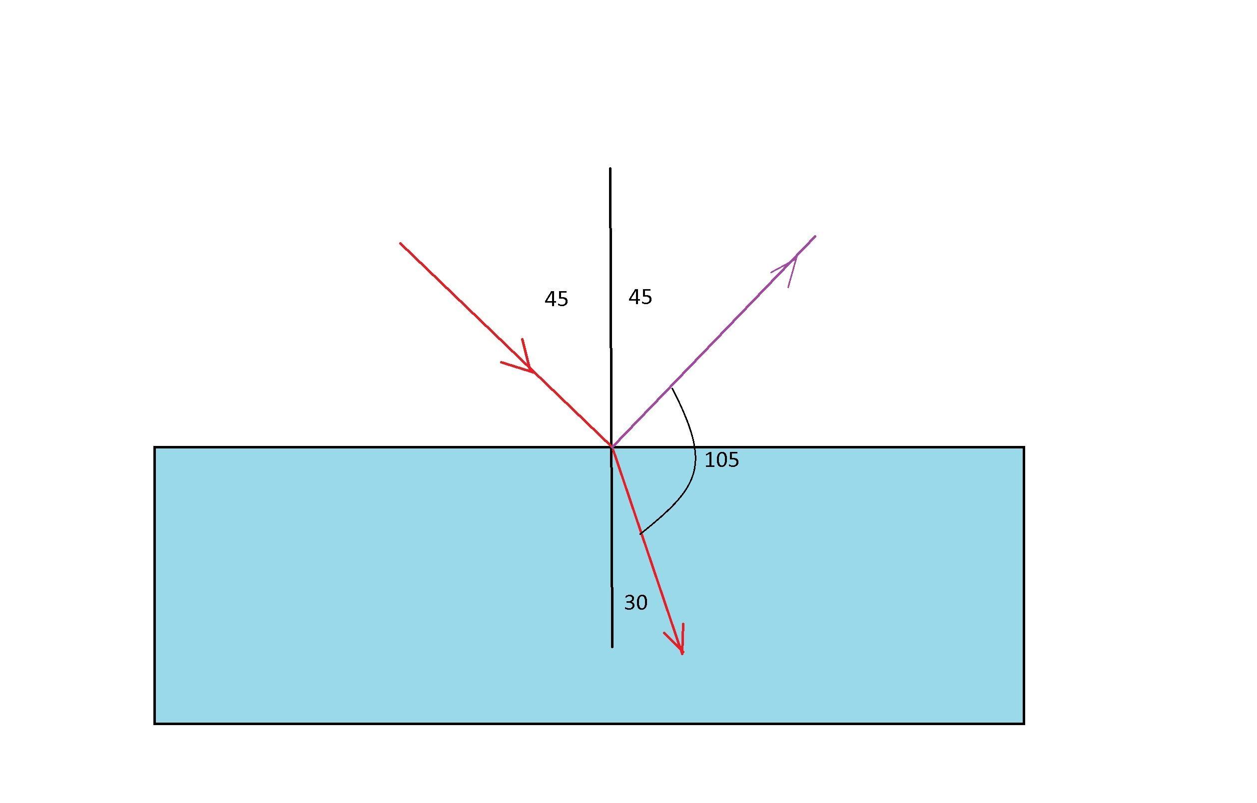 Угол между отраженным и преломленным лучами 105°. Каков угол преломления, если угол падения луча 45°? Сделать рисунок.