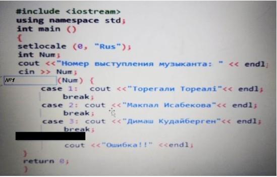 Намечается большой концерт в день независимости Республики Казахстан в городе Тараз. Специально для ведущих концерта начали разрабатывать компьютерную программу для определения порядка выступления музыкантов. Помогите закончить программу, для этого дополните пустой блок №1.