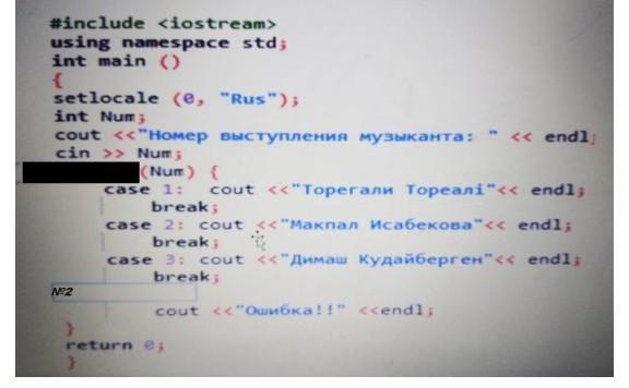 Намечается большой концерт в день независимости Республики Казахстан в городе Тараз. Специально для ведущих концерта начали разрабатывать компьютерную программу для определения порядка выступления музыкантов. Помогите закончить программу, для этого дополните пустой блок №2.