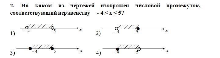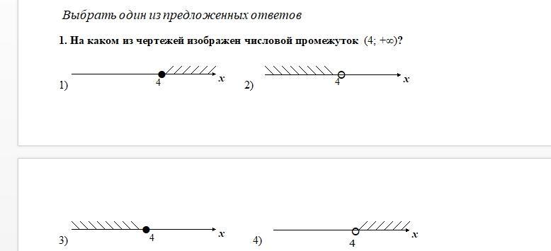 1. Числовой промежуток - строгое неравенство (круглые скобки). Ему соответствует вариант 4 (точка слева выколота)