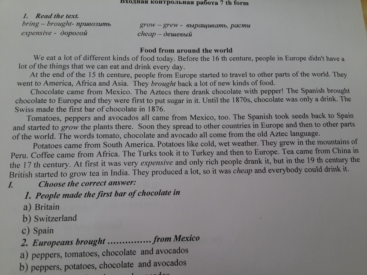 Картошка пришла к нам из Южной Америки. Картофель любит холодную, влажную погоду. Они растут в горах в Перу. Кофе пришел из Африки. Турки привезли его в Турцию и потом во всю Европу. Чай пришел из Китая в 17 веке. Сначала он был очень дорогим, и только богачи его пили, но в 19 веке Британцы начали растить его в Индии. Они производили его много, и чай стал дешевым продуктом, и каждый мог его выпить.