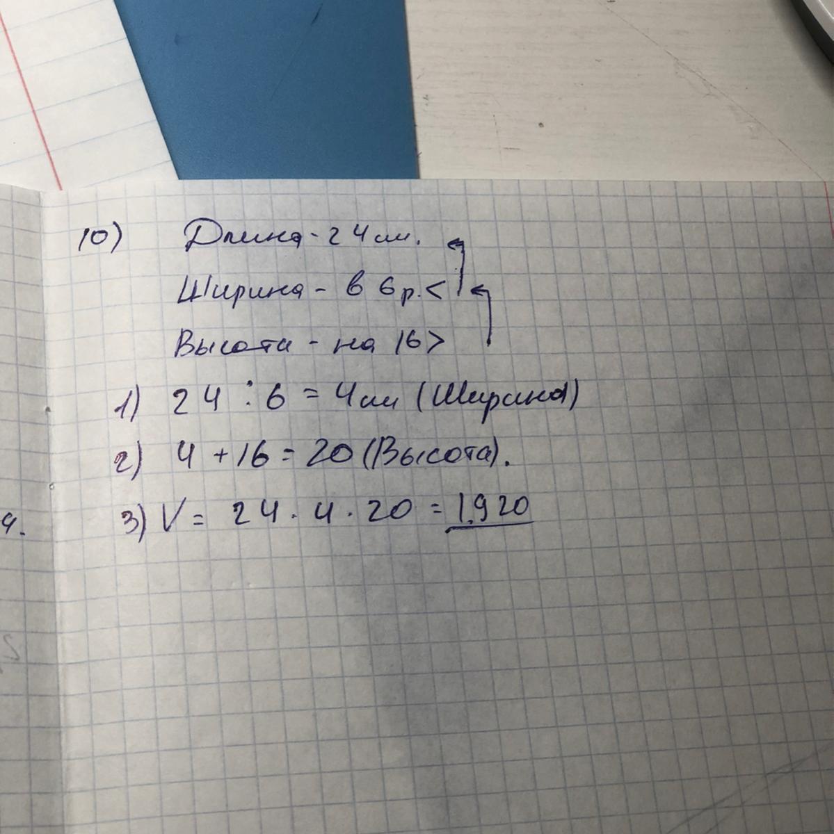 Длина прямоугольного параллелепипеда равна 24 см, ширина в 6 раз меньше длины, а высота на 16 см больше ширины. Найдите объем параллелепипеда.
