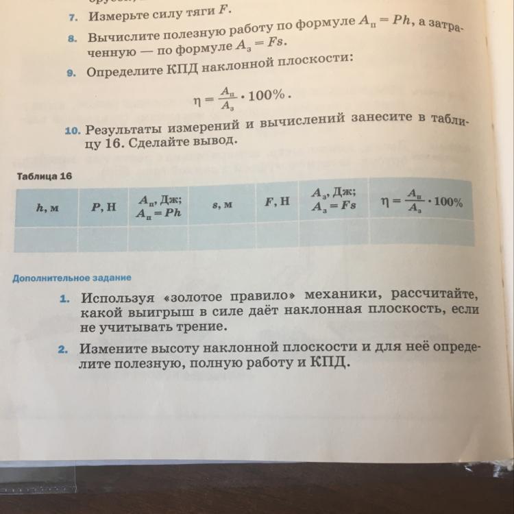 . Откройте учебник на стр. 215, напишите название работы, цель, приборы, в ходе работы сделайте рис 206 и таблицу 16 (стр. 216),занесите данные для первого опыта в таблицу: высота наклонной плоскости 10 см, вес бруска 2 Н, путь 50 см, сила тяги 1,2 Н. В таблице высоту и путь запишите в метрах, заполните 3,6,7 столбцы, сделав все расчеты под таблицей с указанием формул. Конт. вопросы стр. 192 (1,2,4,5), сделайте вывод. Это объем на "4". На "5" + доп зад. 1и 2 для высоты 15см,вес2 Н,сила тяги 1,5Н,путь 50 см
