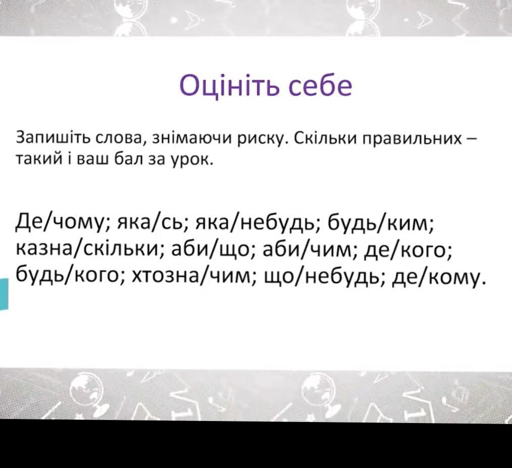 дечому, якась, яка-небудь, будь-ким, казна-скільки, абищо, абичим, декого, будь-кого, хтозна-чим, що-небудь, декому