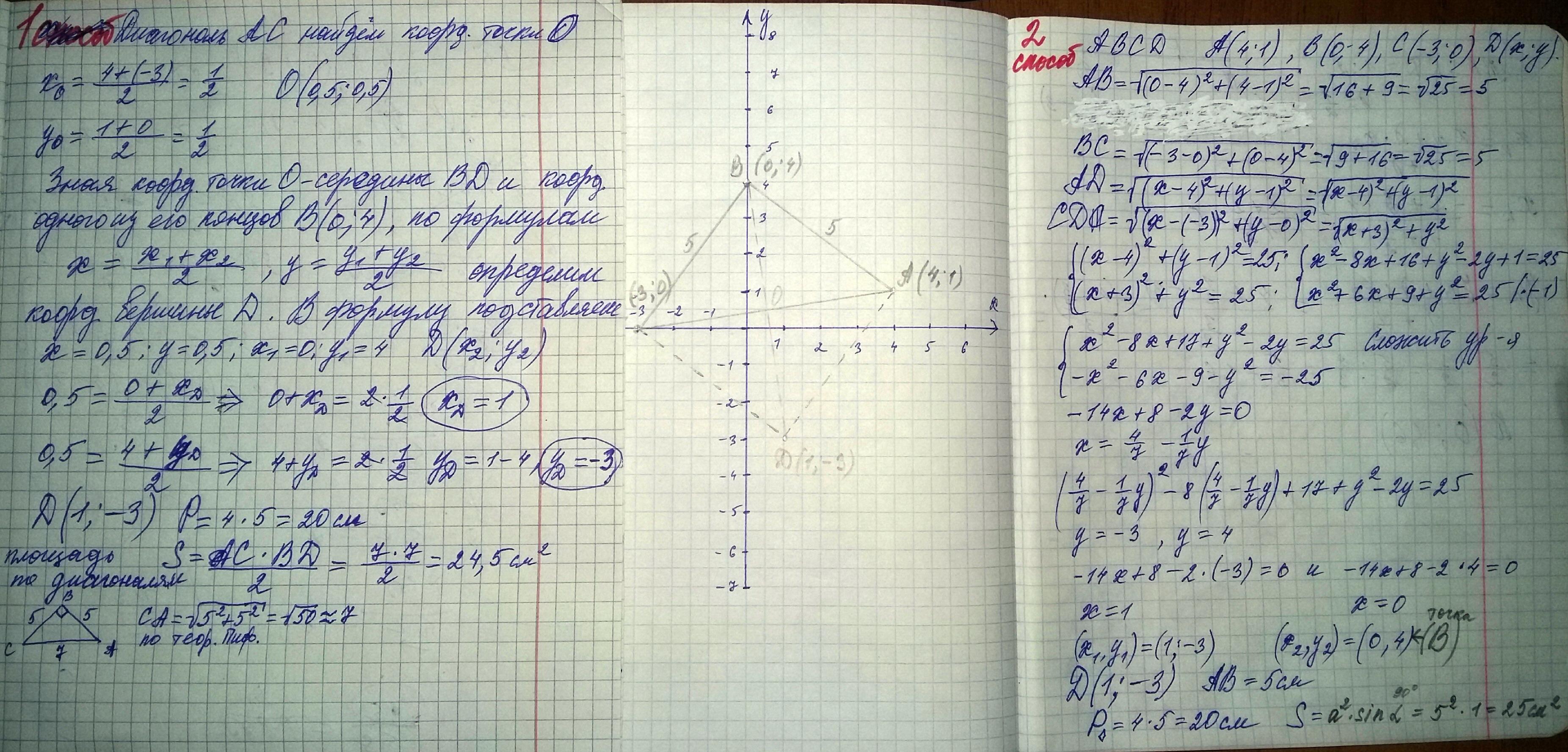 известны координаты трех вершин ромба ABCD : A(4;1) , B(0;4), C(-3;0) Найти координаты четвертой вершины D, периметр и площадь ромба