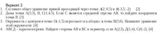 1. составьте общее уравнение прямой проходящей через точки А (2;0.5) и В (-3.5;-2)
