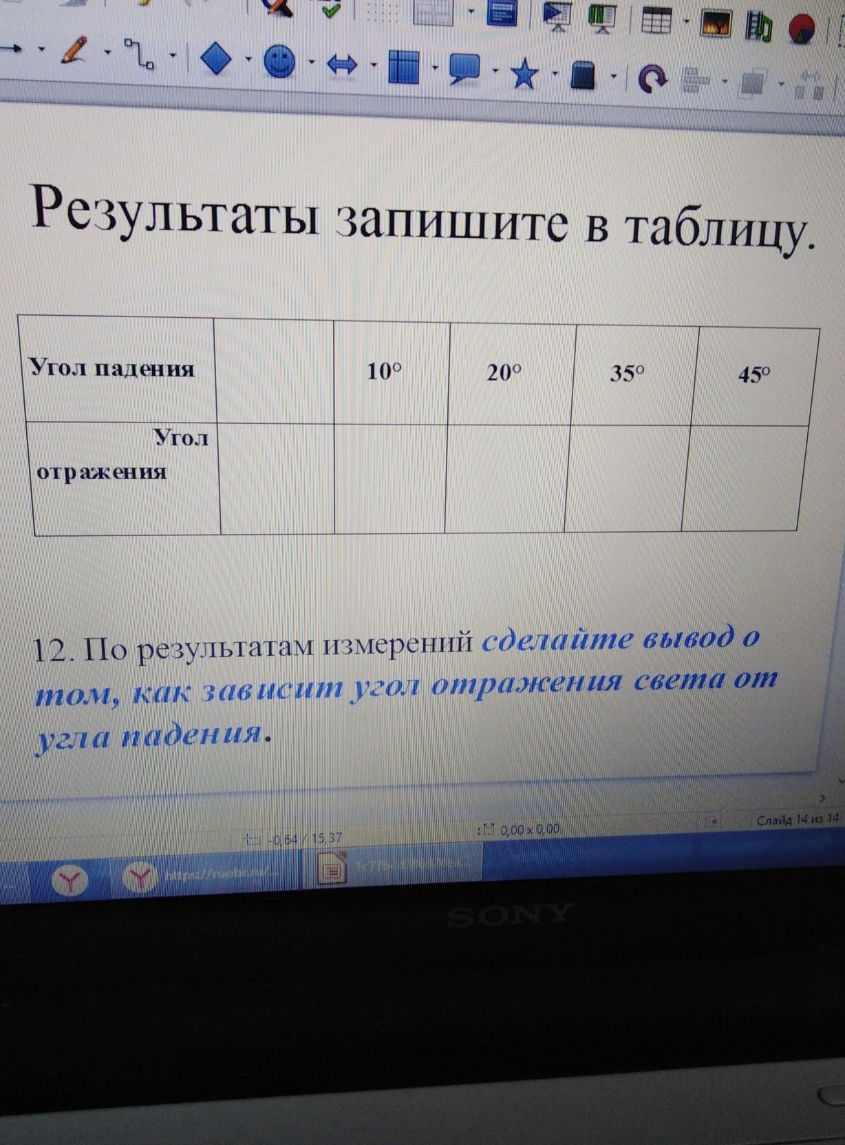 8. Определите и запишите в таблицу величины углов отражения и падения света на зеркало в начале опыта.