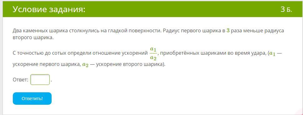 Два каменных шарика столкнулись на гладкой поверхности. Радиус первого шарика в 3 раза меньше радиуса второго шарика.