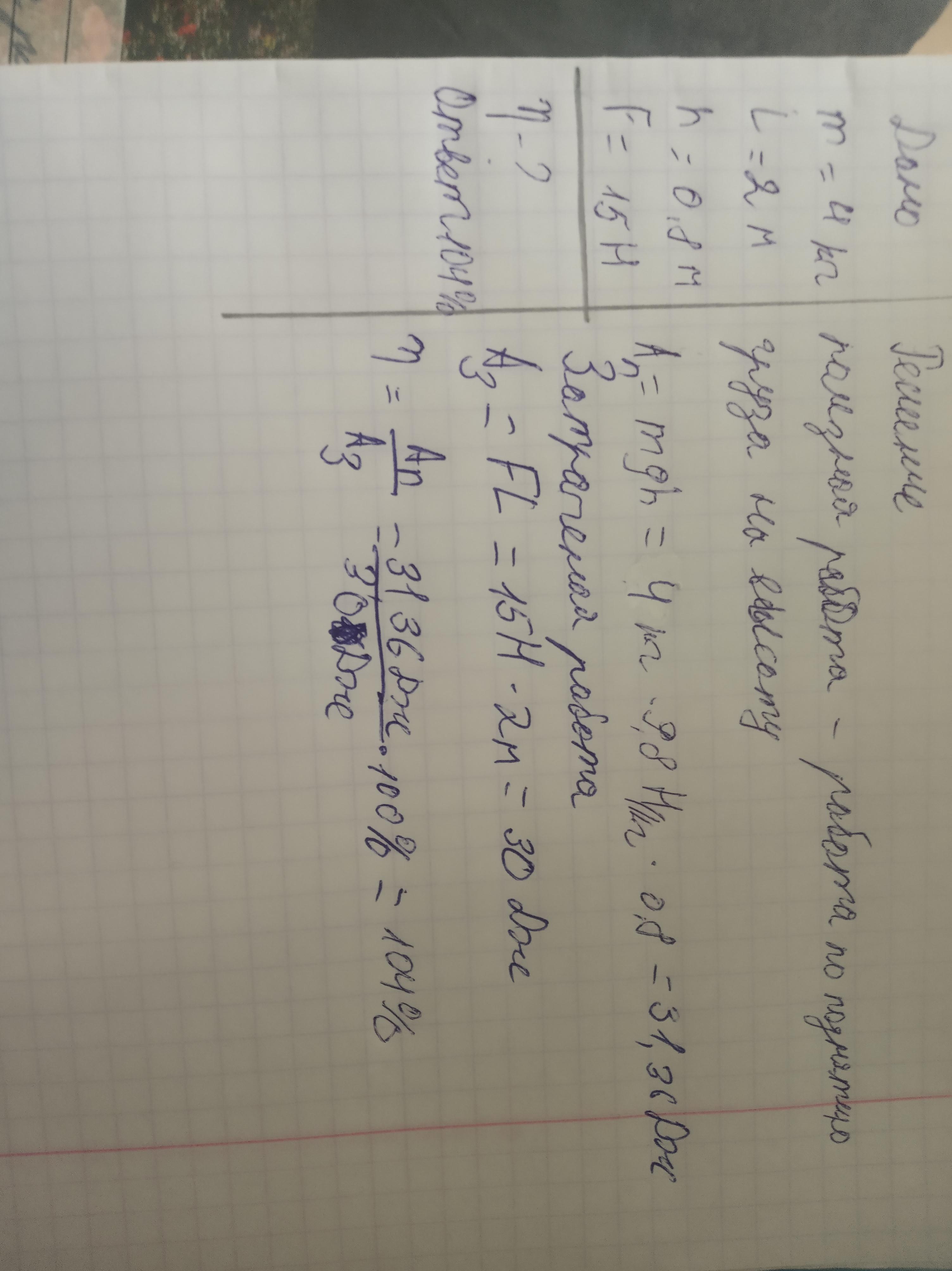 Груз массой 4 кг равномерно переместили к вершине наклонной плоскости длиной 2 м и высотой 0,8 м. При этом была приложена сила 15 Н. Каков КПД установки? (при решении схематично показать данную ситуацию)