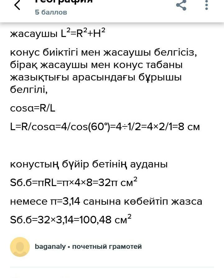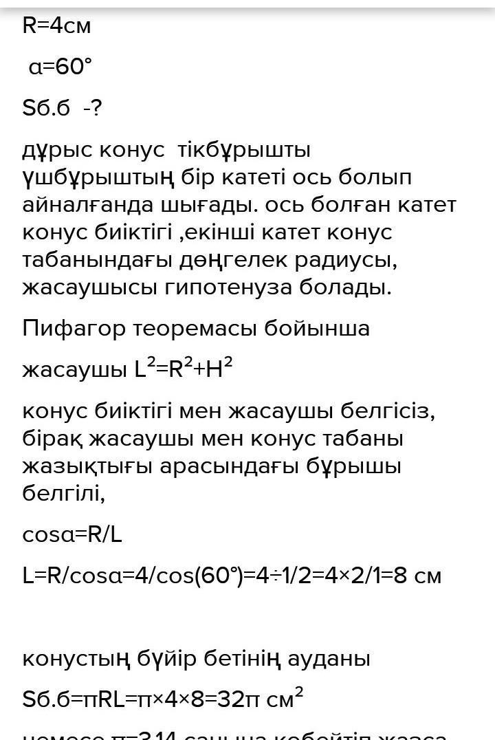 4. Конустың бүйір бетінің ауданы табан ауданынан екі есе артық болса, жазбасының бұрышын анықтаңдар.
