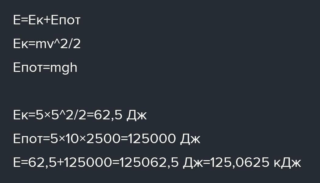 определите полную механическую энергию (в кДж) тела, летящего на высоте 800 метров над поверхностью Земли со скоростью 25м/с масса тела 5кг, коэффициент g=10 Н/кг