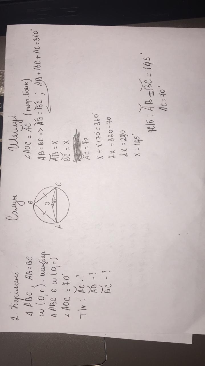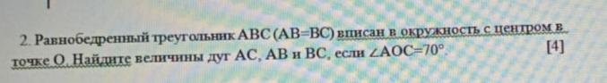 равнобедренный треугольник abc (ab=bc) вписана окружность с центром в точне O ,найдите велтчины дуг AC,AB и BC если угол AOC =70°