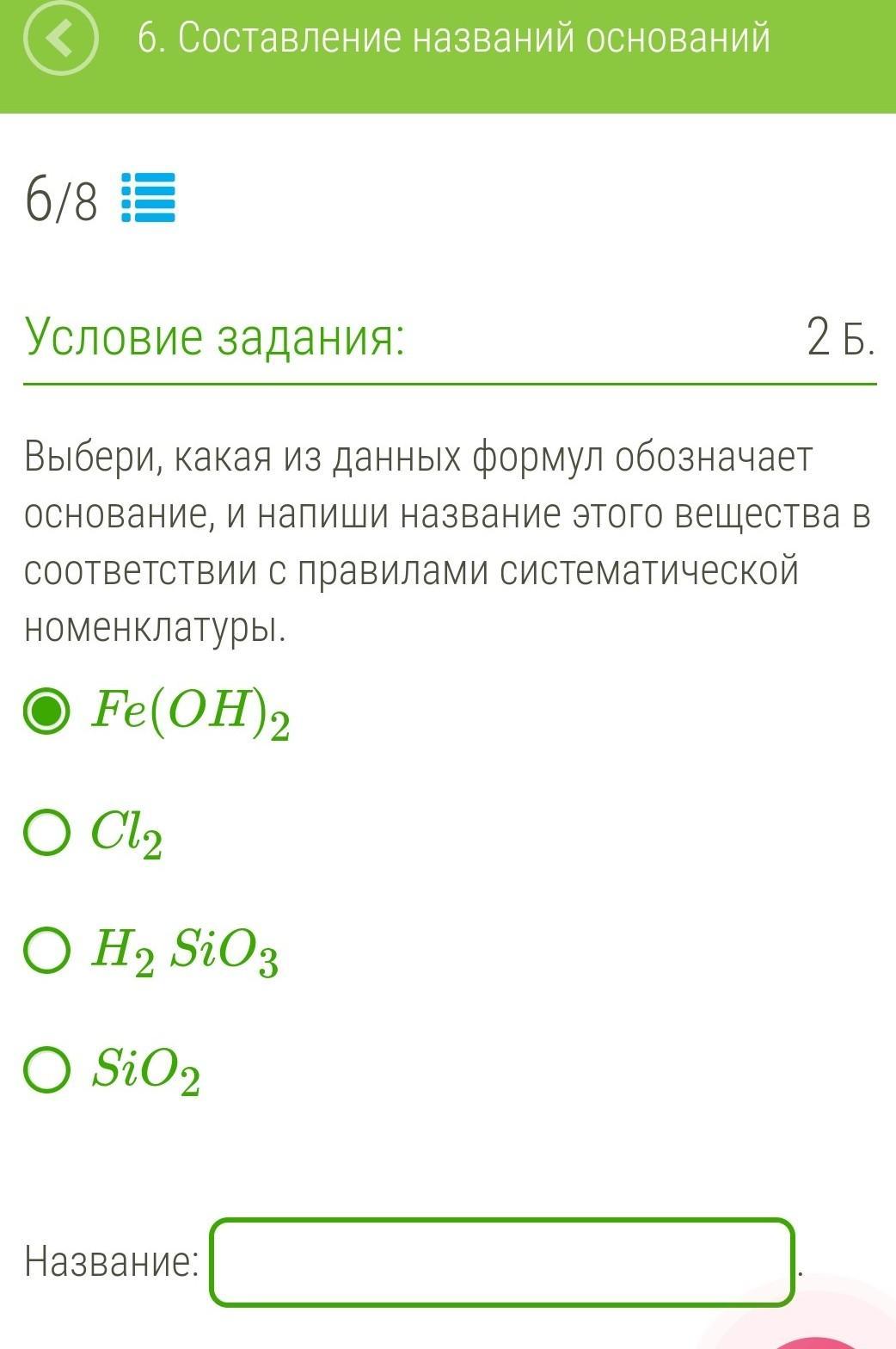 Основание — сложное вещество, которое состоит из атома металла и гидроксогруппы (−OH).