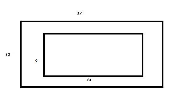 Нужно сделать к задаче чертёж в удобном масштабе. Не знаю как но как нибудь попытайтесь) В центре прямоугольного сквера длиной 17 м и шириной 12 м разбили прямоугольный цветник длиной 14 м и шириной 9 м.Остальную часть парка занимают дорожки.Определи площадь дорожек.