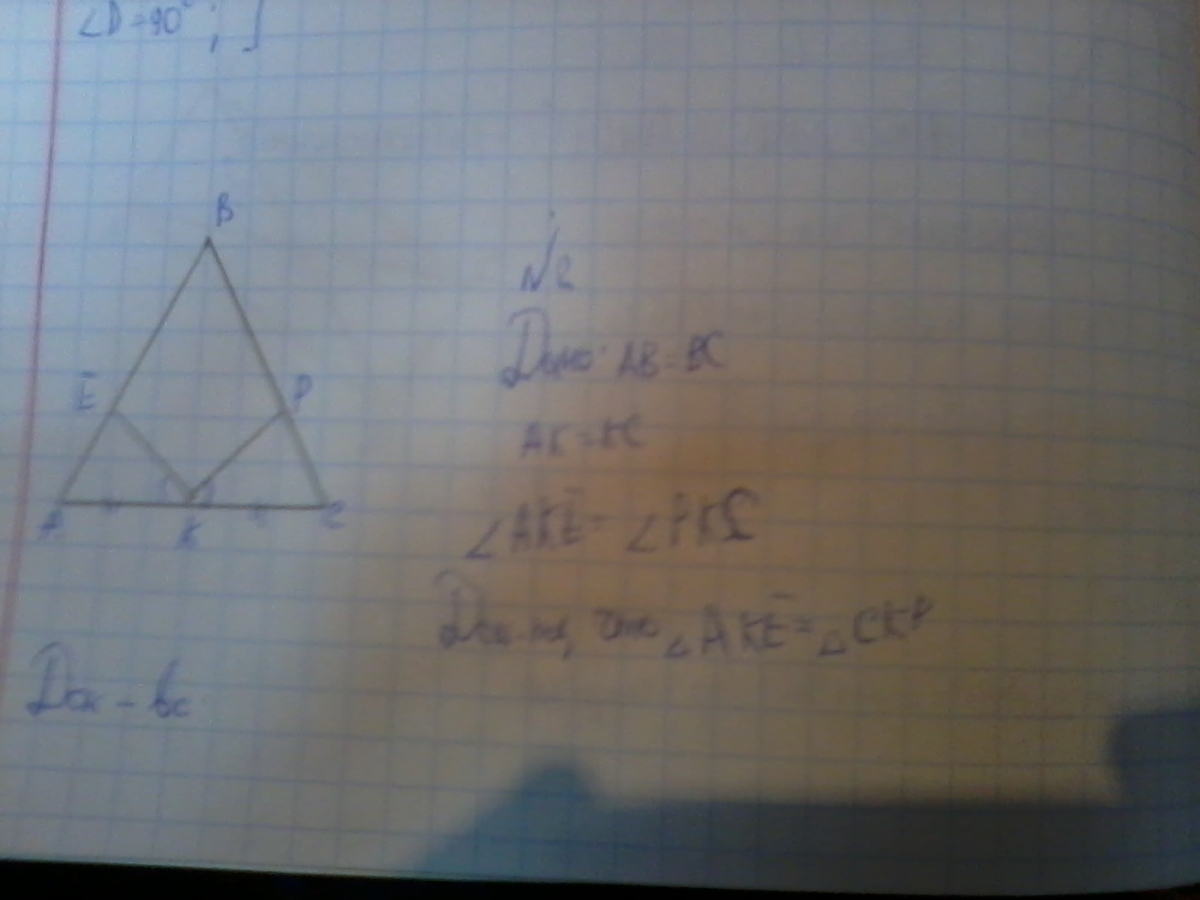 рассмотрим треугольник ake и ckp: ak=kc(по усл), уголAKE=углуPKC(по усл), угол a= углу c(по ранее доказанному)=>треугольники равны по 3 признаку равенства треугольников