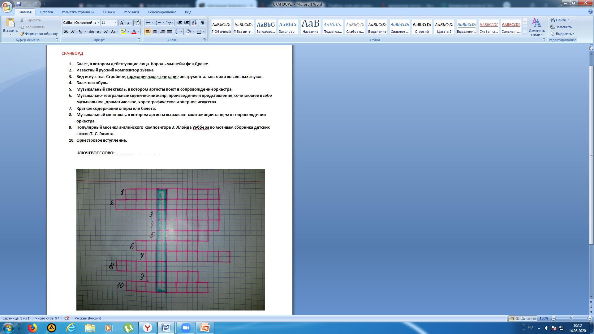 - 1.Щелкунчик 2.М.И. Глинка 3.Аккорд 4.Пуанты 5.Опера 6.Мюзикл 7.Либретто 8.Балет 9.Кошки 10.Увертюра
