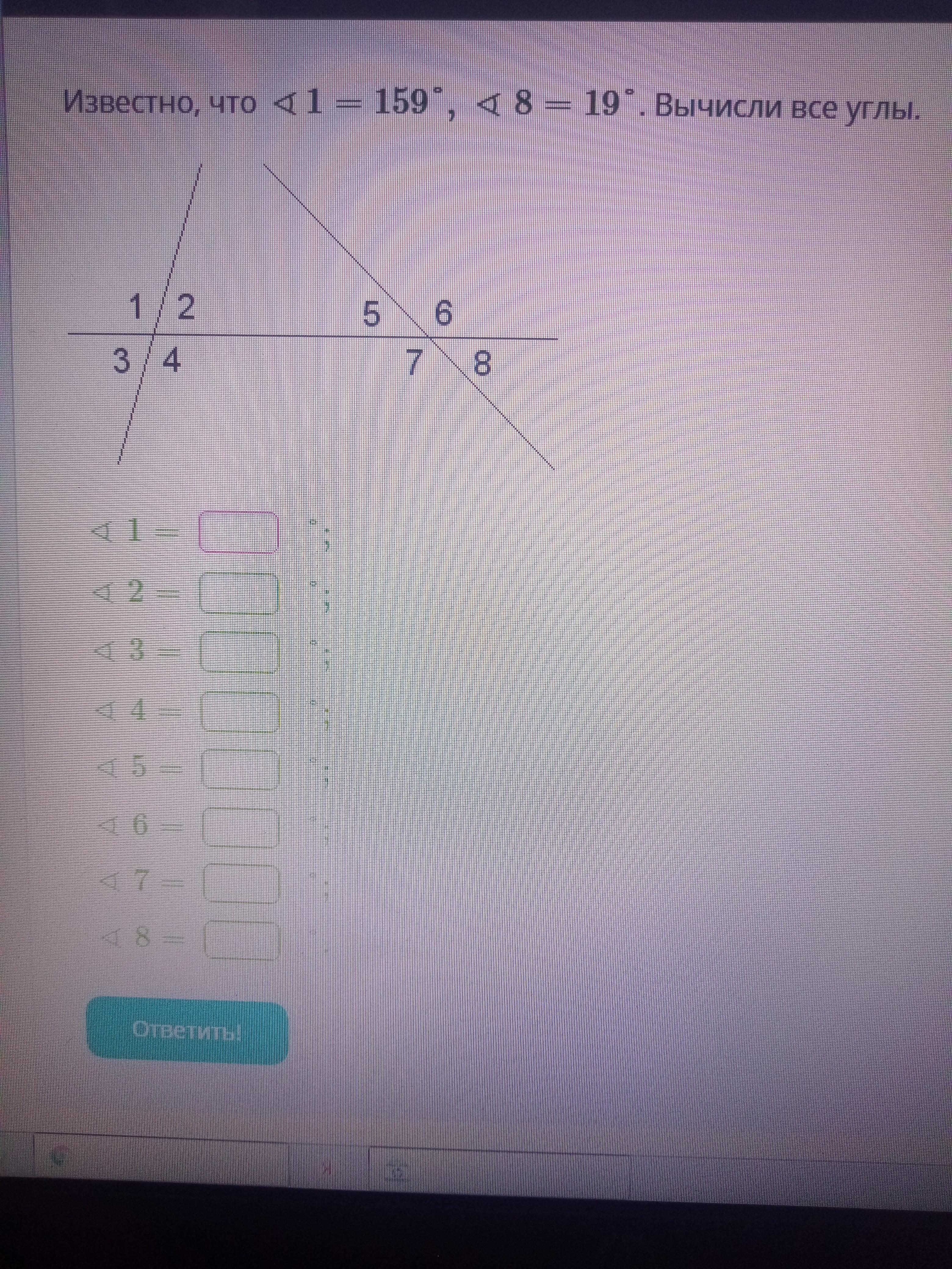 Известно, что ∢1=159°,∢8=19°. Вычисли все углы.