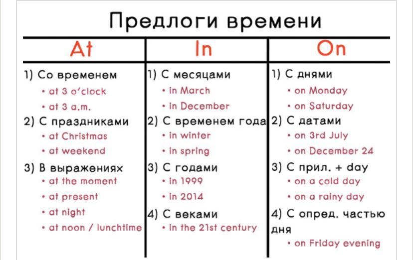 Complete the sentences with at, on or in. I usually get up _________ 7 o’clock in the morning. 2) My mum’s birthday is _________ December. 3) Her dad comes back from work at 8 o’clock ________ the evening. 4) We always go for a walk __________ the weekend. 5) My grandparents visit us _________ Sundays.
