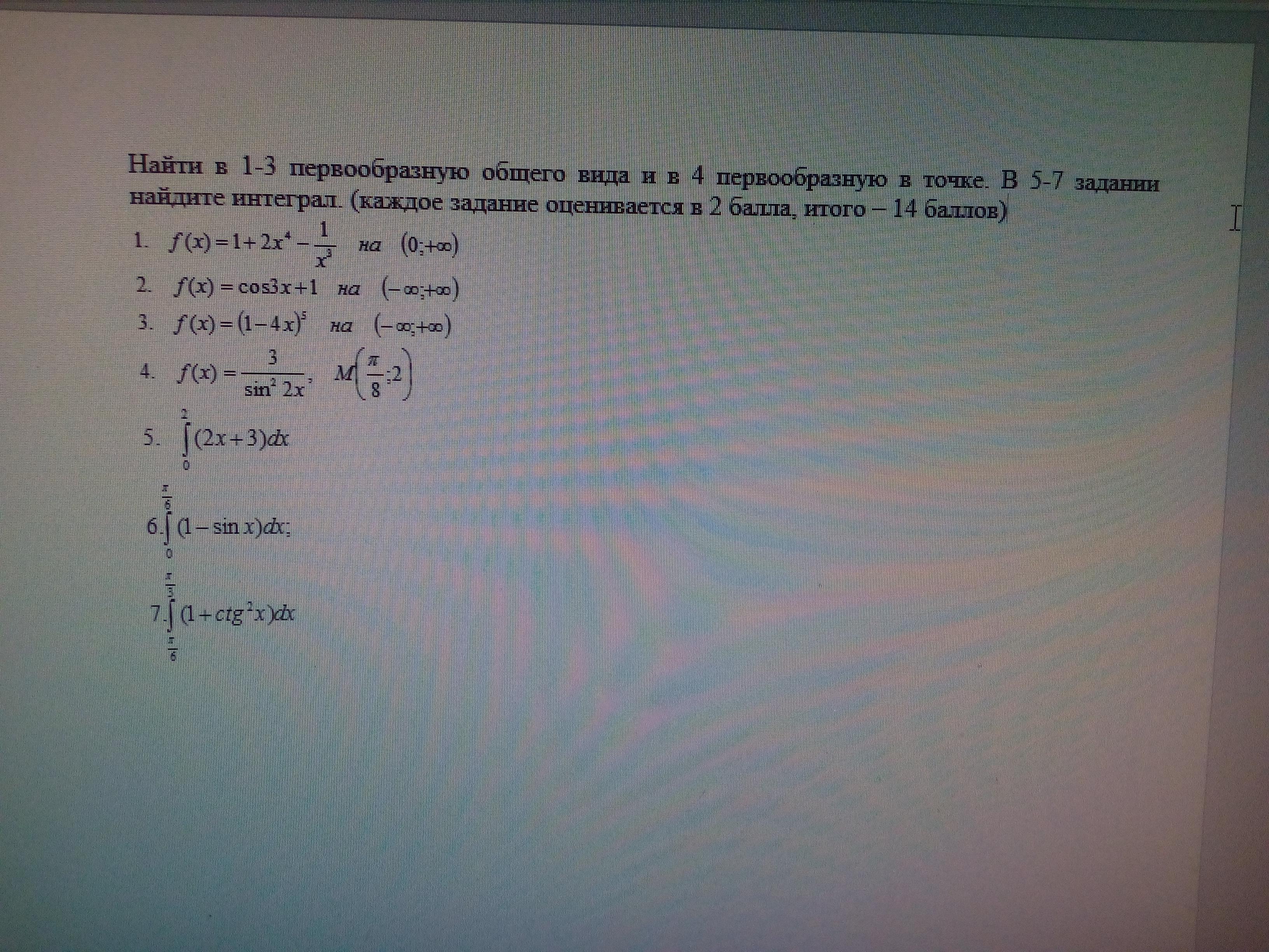 Найти в 1-3 первообразную общего вида и в 4 первообразную в точке. В 5-7 задании найдите интеграл