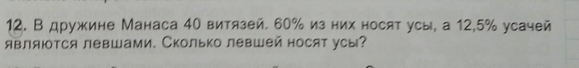 40-це 100%, а х-це 60% х=40*60/100=24 вітязі з вусами., серед них є ті , що вважаються шульгами( лівшами) і їх 12,5 % знайдемо їх