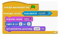 Когда вы запускаете скрипт, спрайт всегда если будет касаться края будет мяукать, идти в центр и будет возвращаться в стандартный размер.