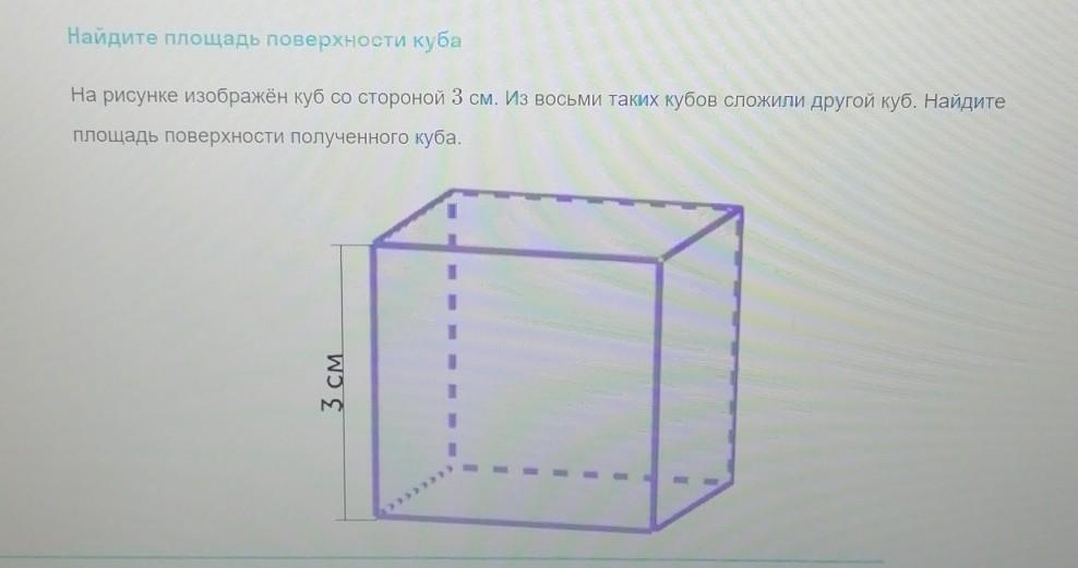 На рисунке зображен куб со стороной 3 см. Из восьми таких кубор сложили другой куб. Найдите