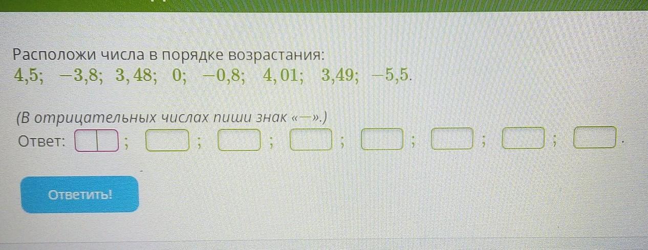 Для начала порядок возрастания- это от меньшего к большему. Если перед числом стоит минус, то это число меньше. так что -5,5: -3,8 и 0,8 это самые маленькие числа. Потом идёт 0. И потом все остальные числа в порядке возрастания.