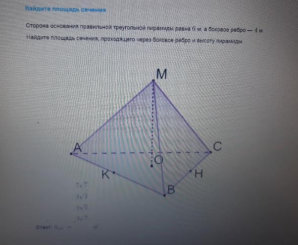 Сторона основания правильной треугольной пирамиды равна 6 м, а боковое ребро-4 м.Найдите площадь сечения,проходящего через боковое ребро и высоту пирамиды.