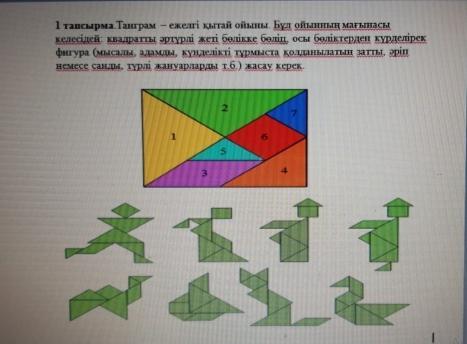 Танграм - ежелгі қытай ойыны. Бұл ойынның мағынасы келесідей: квадратты әртүрлі жеті бөллікке бөліп, осы бөліктерден күрделірек фигура (мысалы;: адамды, күнделікті тұрмыста қолданылатын затты әріп немесе санды, түрлі жануарларды т. б.) жасау керек