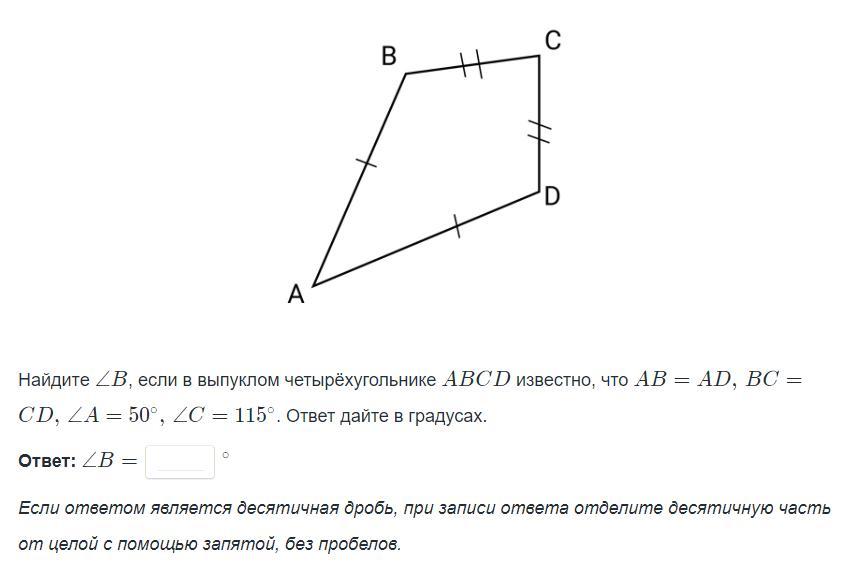 В выпуклом четырехугольнике ABCD известно, что AB=AD,CD=CB,угол A=50град.,угол С=115град.Найдите угол В.Ответ дайте в градусах.
