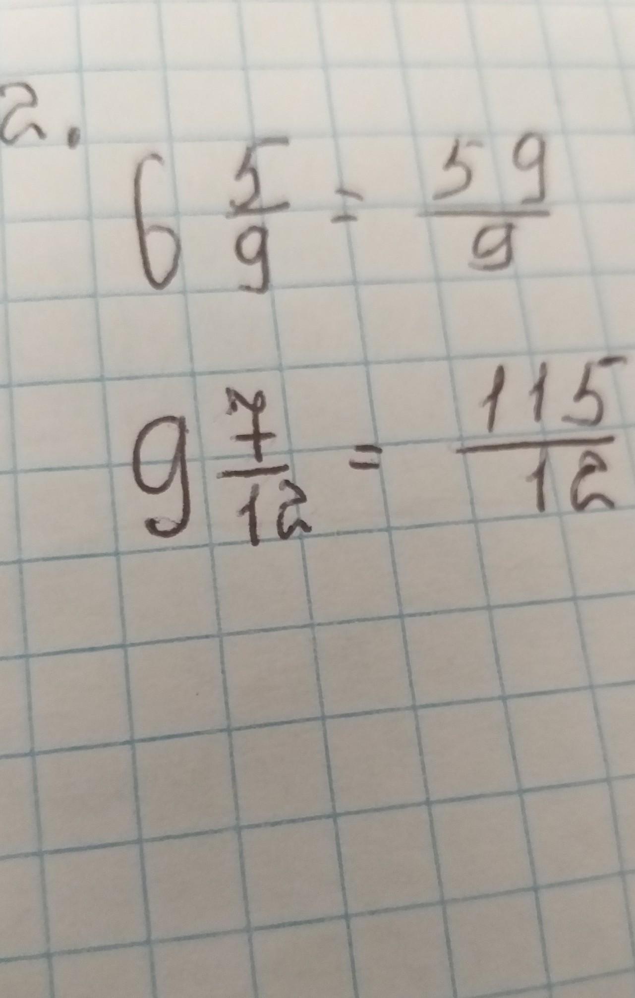 2)перевидите в неправильную дробь шесть целых пять девятых, девять целых семь двенадцатых
