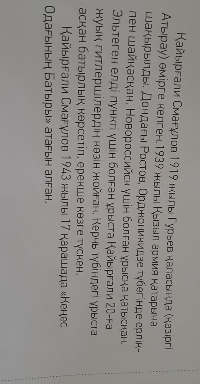 Зат есімдер: "Қайырғали Смағұлов, Гурьев, Атырау, Дондағы Ростов, Орджоникидзе, Новороссийск, Эльтеген, Қайырғали, гитлершілер, Керчь, Батыр."
