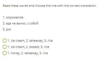 Ответ: 1. Ice cream, takeaway, rice