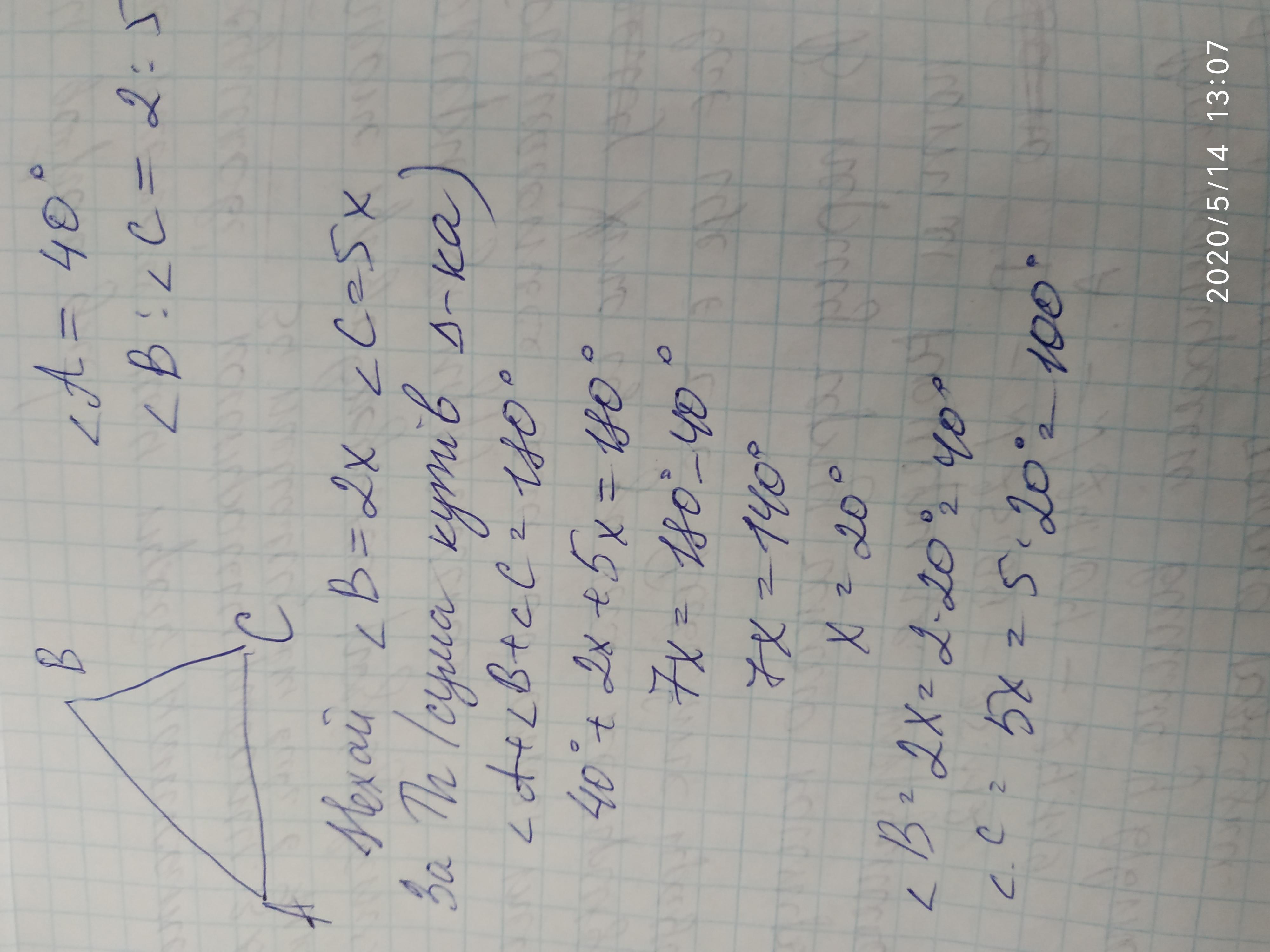 Ответ:Нехай <А=40°, <В:<С=2:5. Знайти усі кути трикутника.
