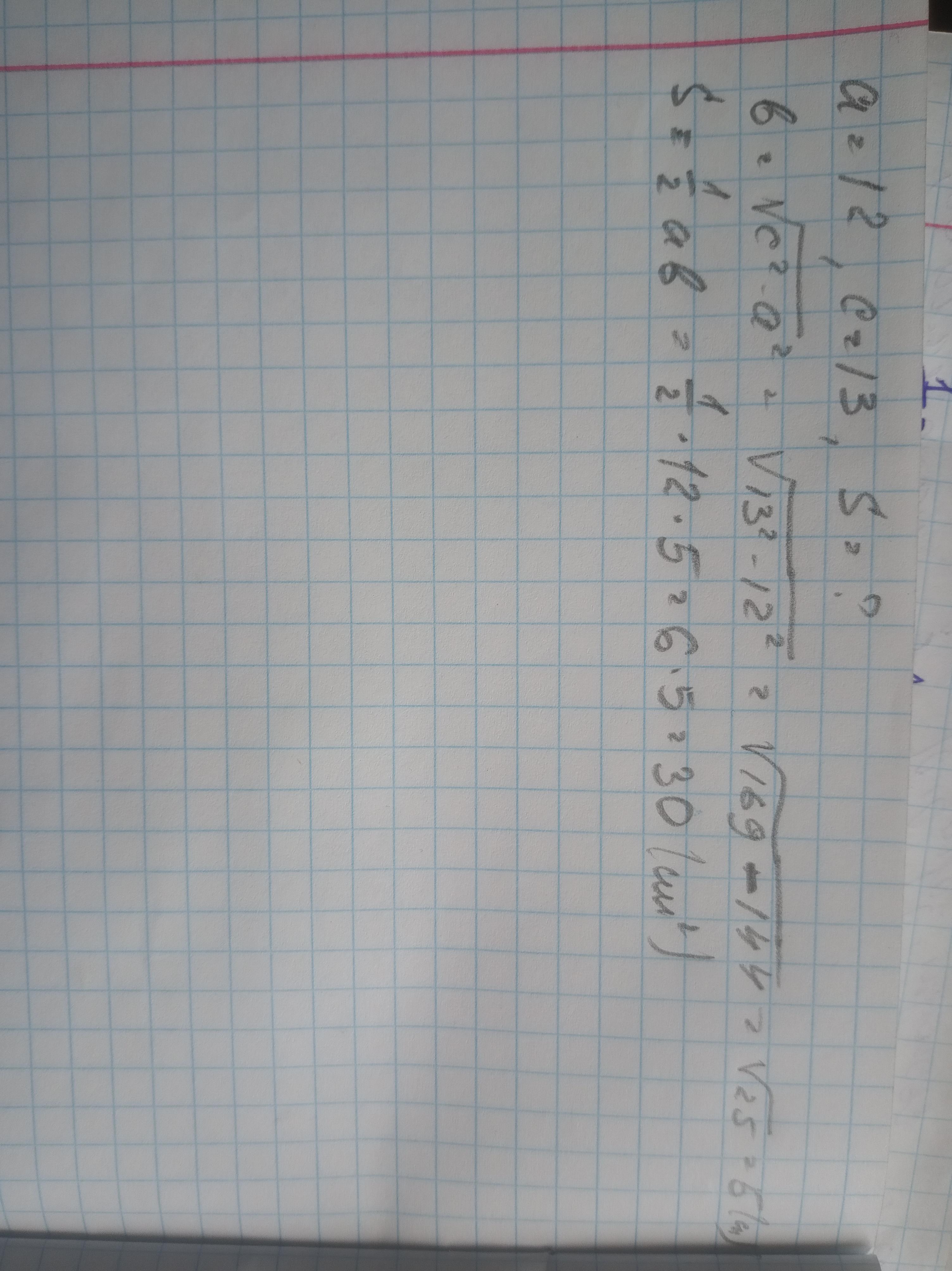 гіпотегуза прямокутного трикутника дорівнює13 см а один із катетів 12см. Знайдить площу трикутника