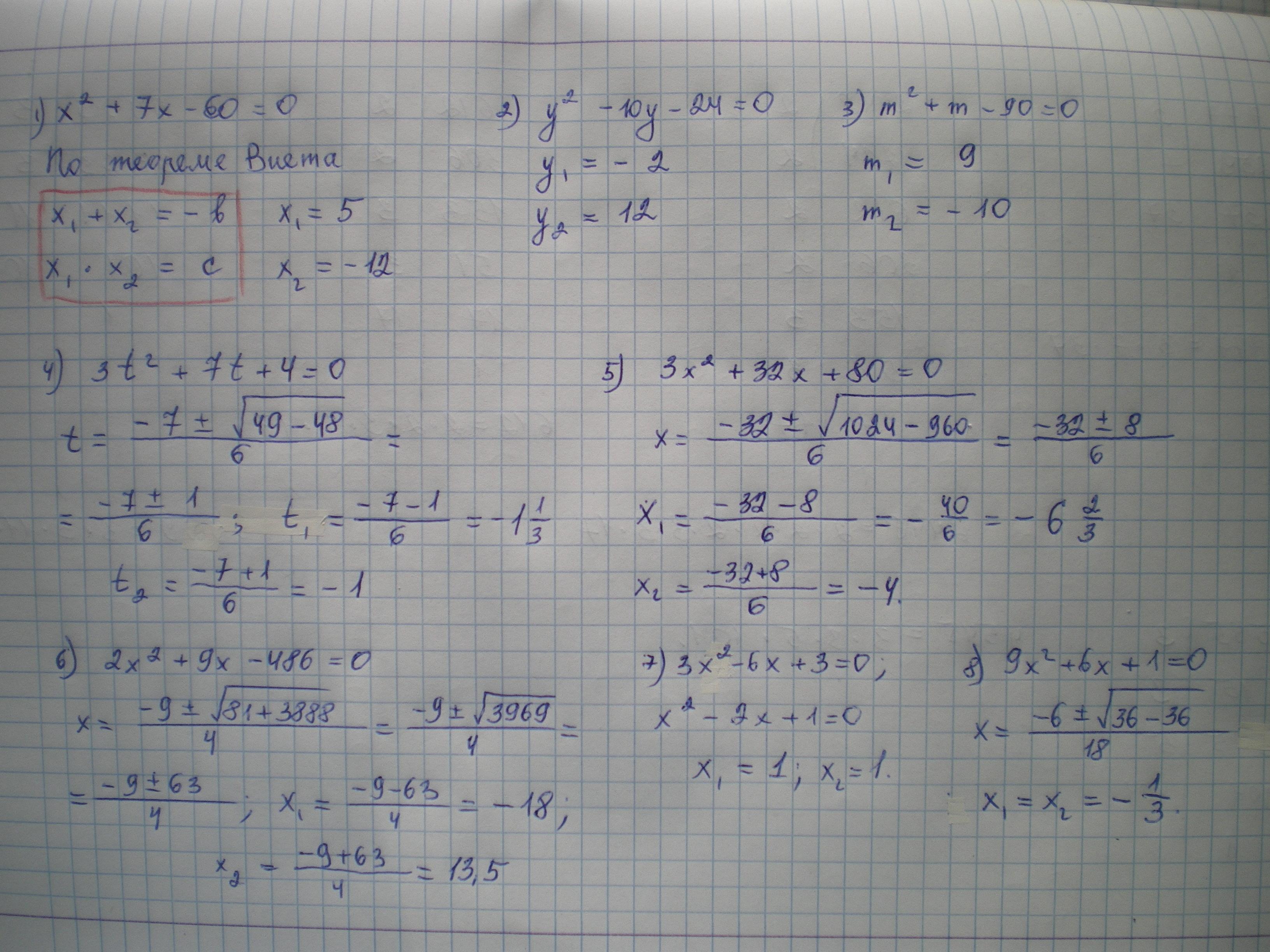 Найдите корни уравнения x²+7x-60=0; y²-10y-24=0; m²+m-90=0; 3t²+7t+4=0; 3x²+32x+80=0; 2x²+9x-486=0; 3x²-6x+3=0; 9x²+6x+1=0;
