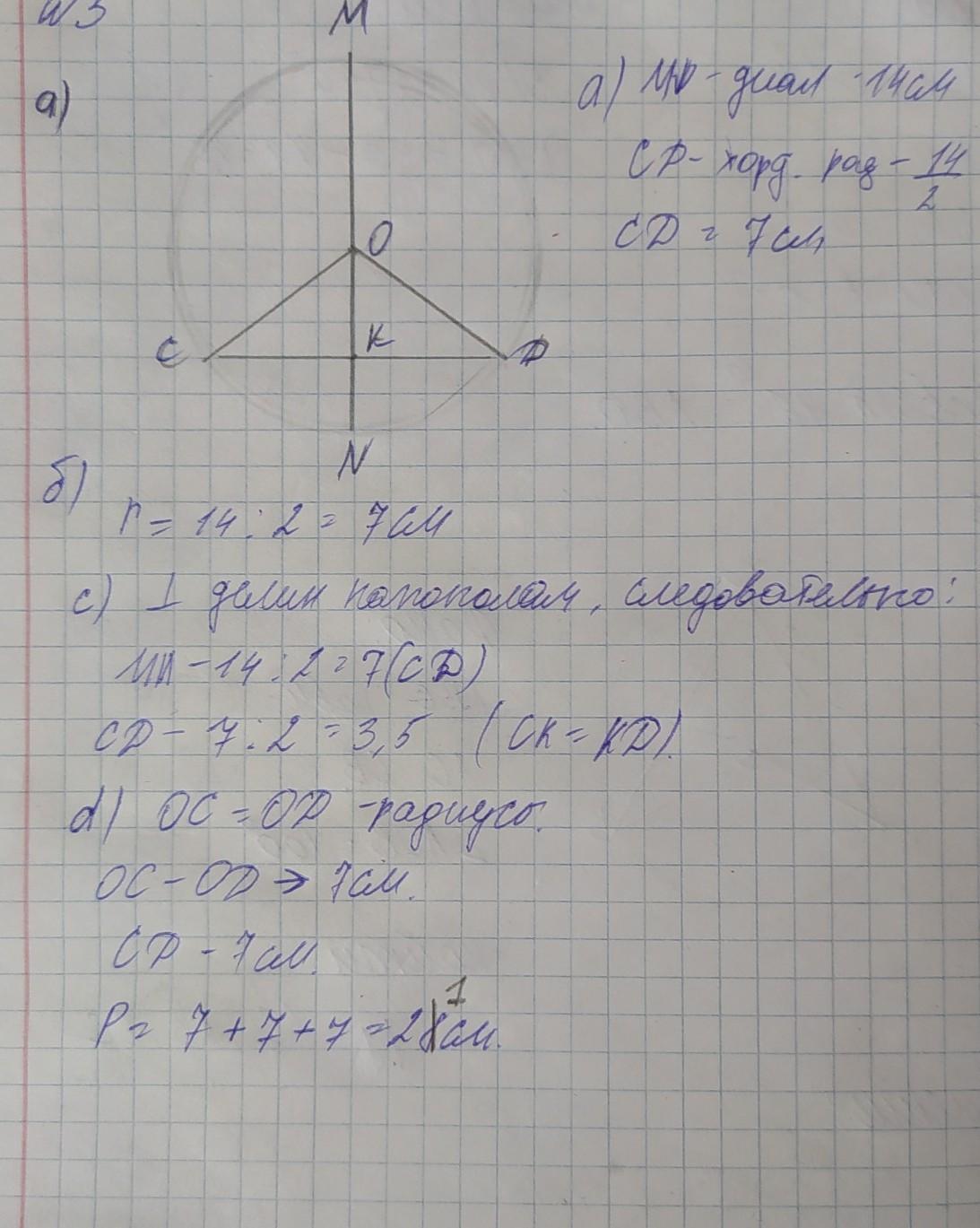 . В окружности с центром в точке О проведен диаметр MN=14 см и хорда CD, перпендикулярная MN и равная радиусу данной окружности. Диаметр MN и хорда CD пересекаются в точке K.