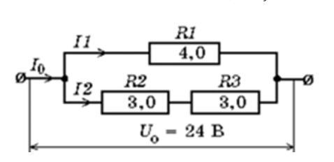 По схеме электрической цепи, показанной на рисунке, вычислите силу тока в амперах в неразветвленной части цепи I_0I