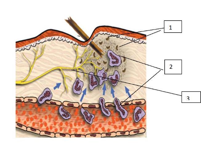 Схема какого процесса, происходящего в организме человека, изображена на рисунке? Что на схеме обозначено цифрами 1-3? Как называется процесс, который происходит в области занозы?