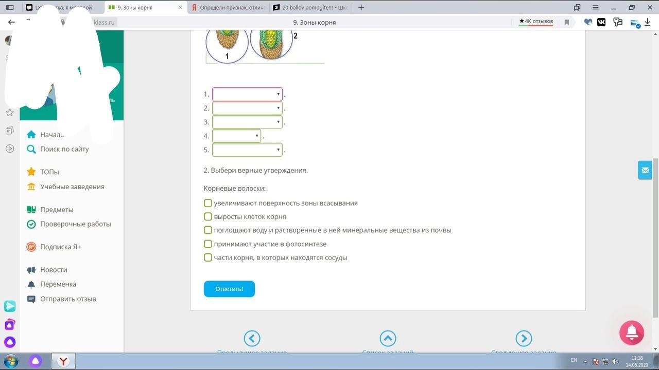 2. Корневые волоски увеличивают зону всасывания, это выросты клеток корня, они поглощают воду и мин.вещества