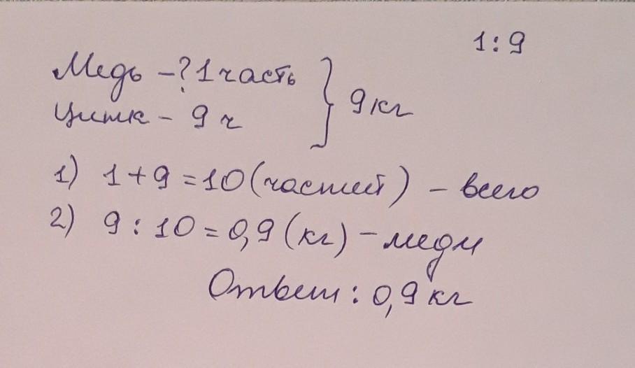 Сплав состоит из меди и цинка. Медь и цинк содержатся в нем в отношении 1:9. Взяли кусок сплава массой 9 килограммов. Сколько килограммов меди в этом куске?