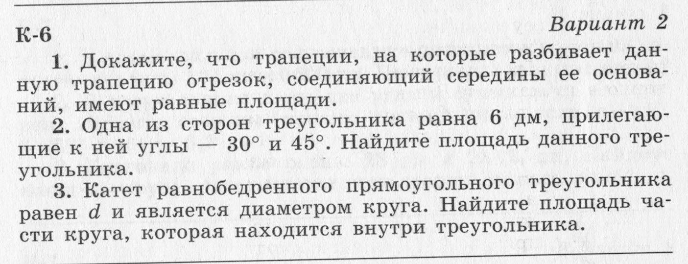 K-6-3. Нетрудно заметить, что радиус окружности будет равен d/2. И площадь фигуры будет равна 1/4 площади окружности + площадь прямоугольного треугольника с катетами d/2.¶