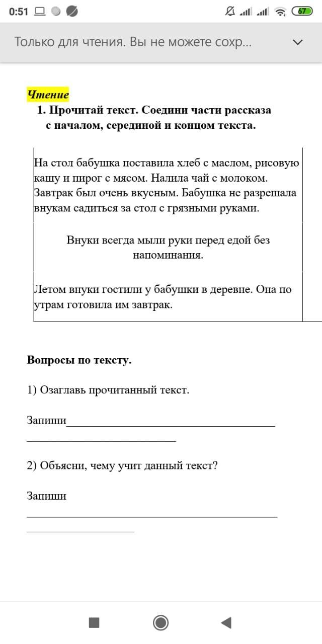 На стол бабушка поставила хлеб с маслом, рисовйю кашу и пирог с мясом. Налила чай с молоком. Завтрак был очень кусным. Бабушка не разрешала внукам садиться за стол с грязными руками.