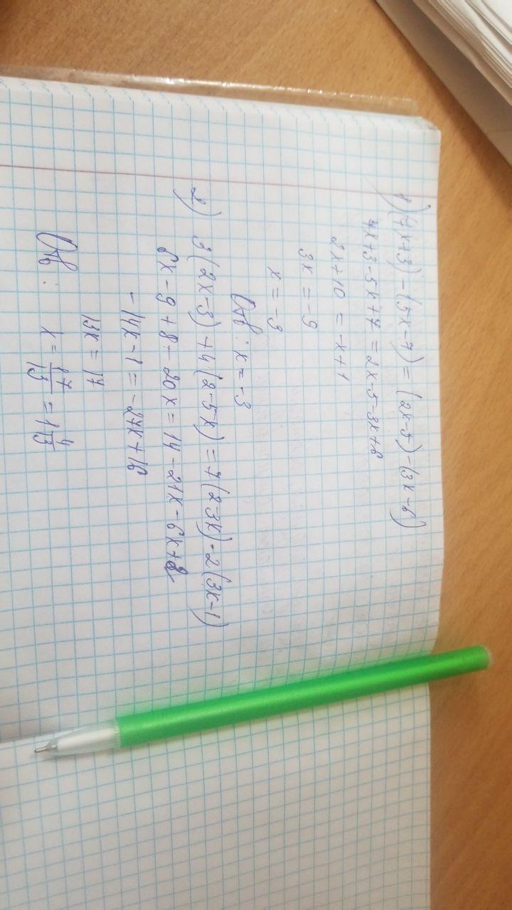 Решите уравнение: 1) (7х+3)-(5х-7)=(2х-5)-(3х-6);. 2)3(2х-3)+4(2-5х)=7(2-3х)-2(3х-1).