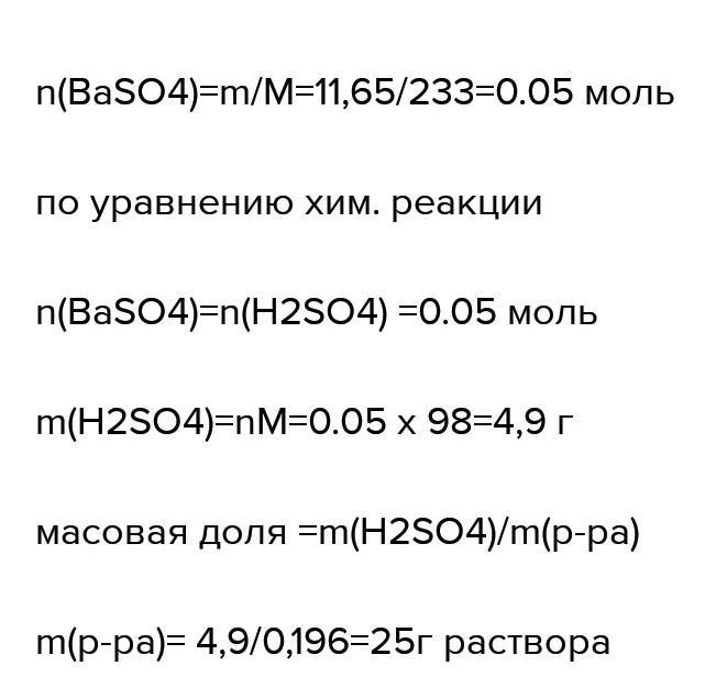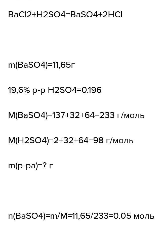 35 балов СРОЧНО ХИМИЯ ЧЕРЕЗ ДАНО Определите массу 19,6%-ного раствора серной кислоты, при взаимодействии которого с хлоридом бария получили 11,65 г сульфата бария.