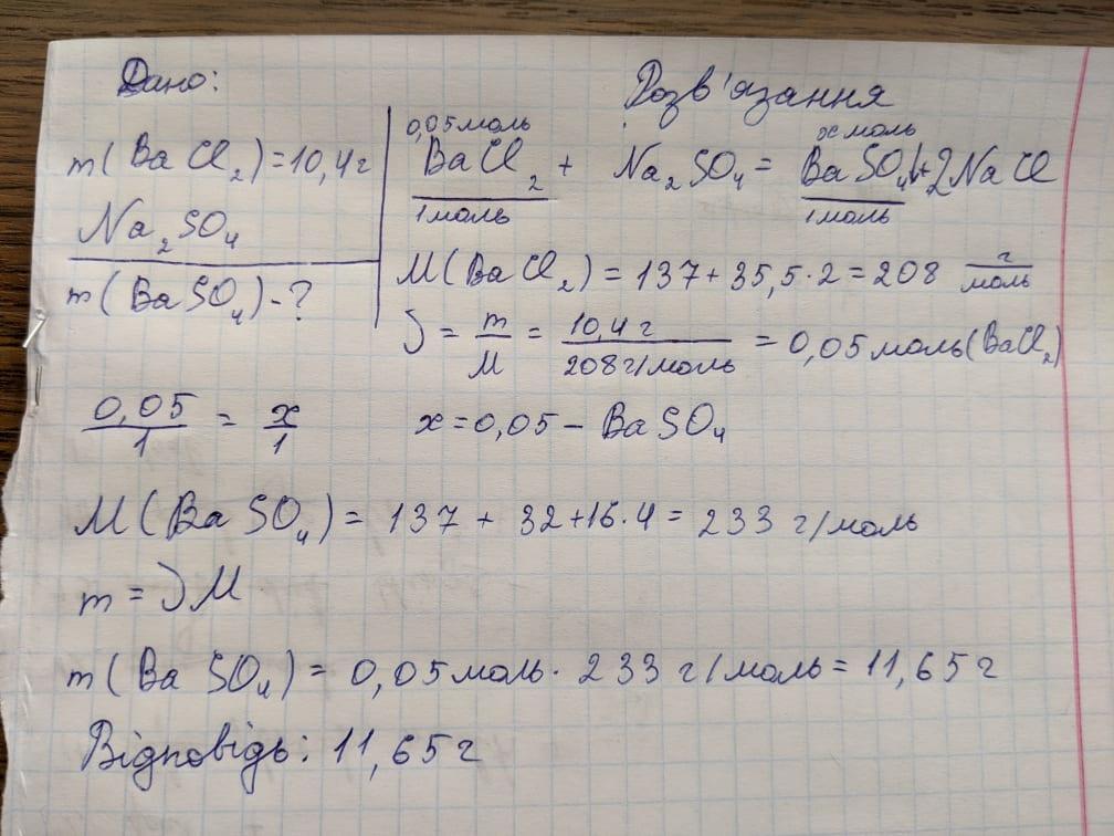 під час взаємодії розчину,що містить 10,4г барій хлориду,з розчином натрій сульфату утворився осад.Знайдіть массу цього осаду