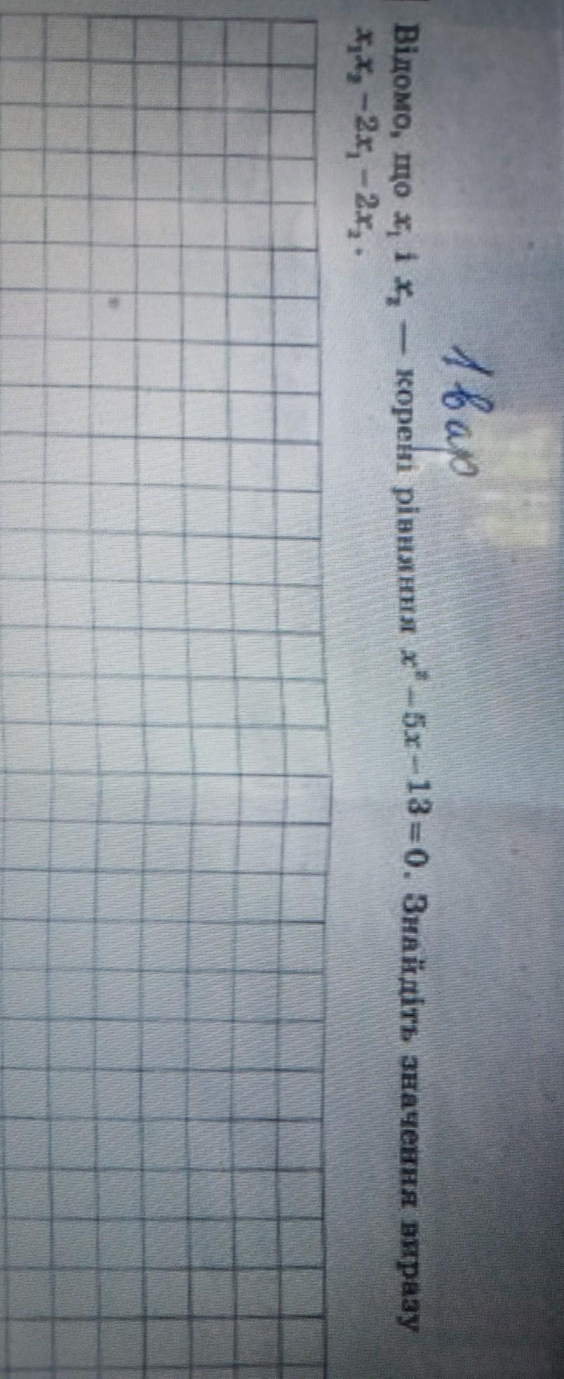 Відомо, що х1 і х2 - корені рівняння х²-5х-13=0. Знайдіть значення виразу х1*х2-2х1-2х2