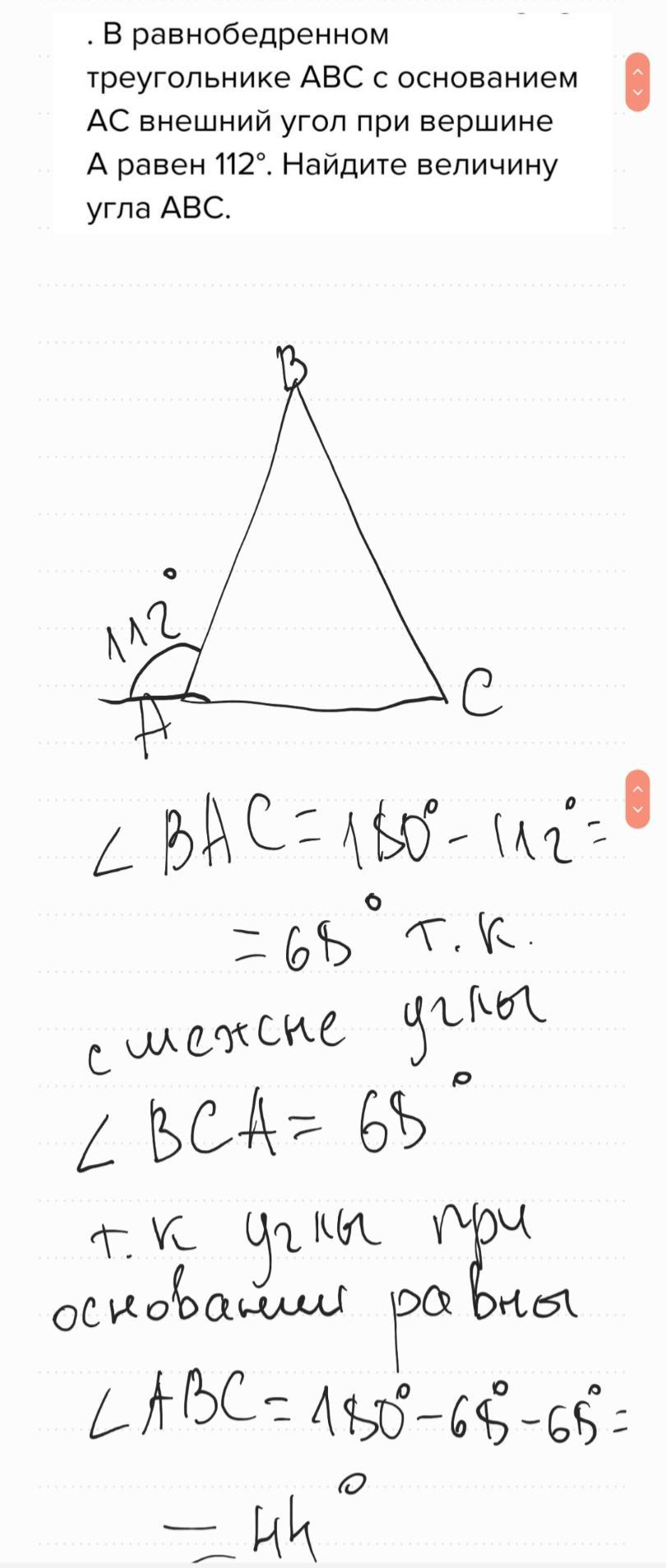 . В равнобедренном треугольнике ABC с основанием AC внешний угол при вершине А равен 112°. Найдите величину угла ABC.